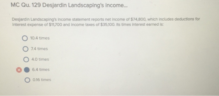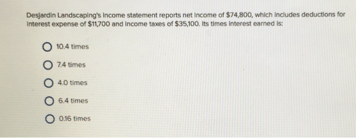 Desjardin Landscapings income statement reports net income of 73500 which includes deductions for interest expense of 10600 and income taxes of 33100. Desjardin Landscapings income statement reports net income of 73500 which includes deductions for interest expense of 10600 and income taxes of 33100. Its times interest earned is.